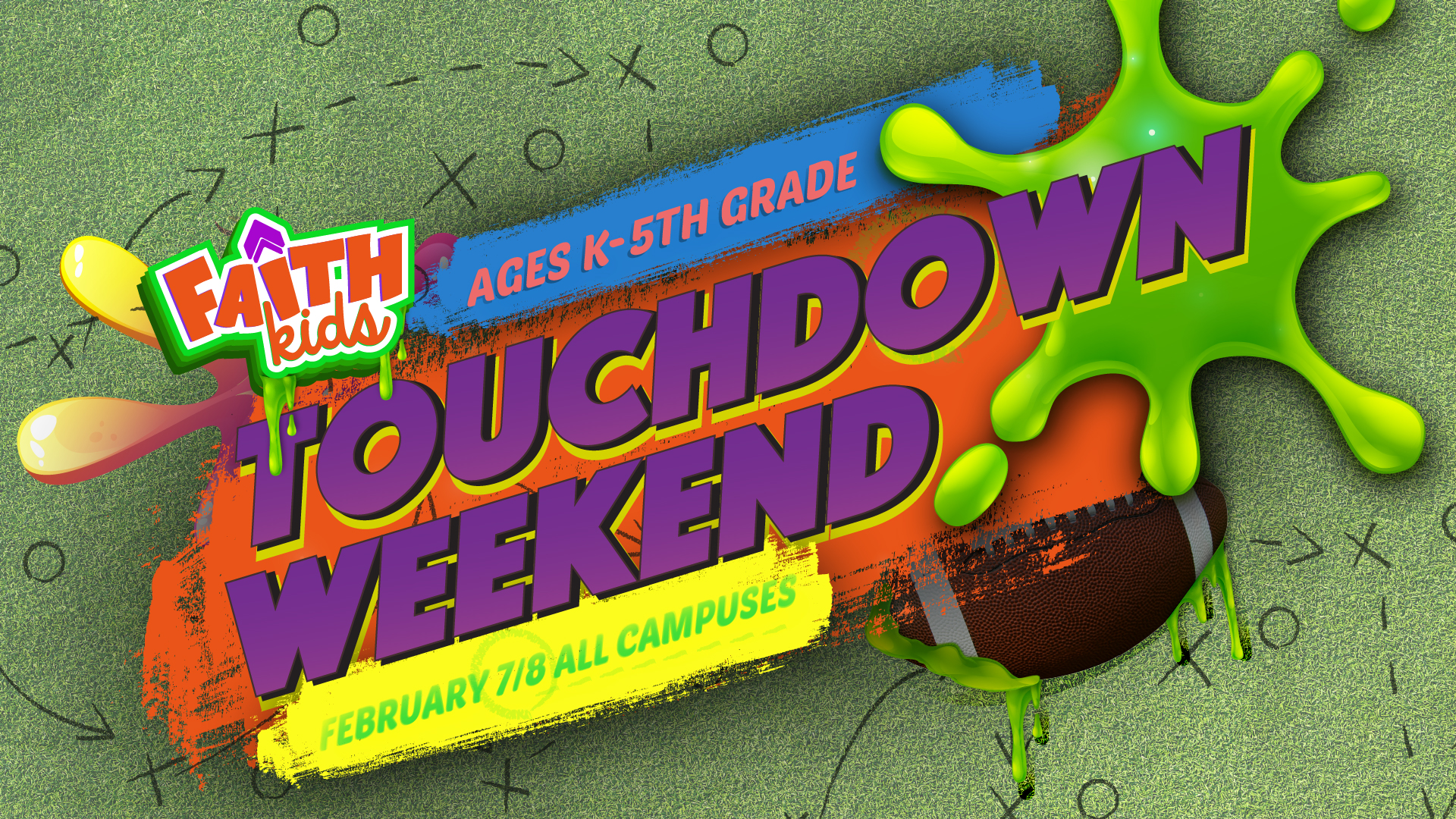 Jerseys on. Snacks ready. Let’s go. Touchdown Weekend is happening at all weekend services across every campus on February 7th & 8th. Drop your kids off in Faith Kids for a high-energy, football-themed experience filled with games, activities, and cheesy nachos. Kids are encouraged to wear their favorite sports jersey and enjoy a welcoming, playful environment designed just for them to have fun and learn about Jesus.